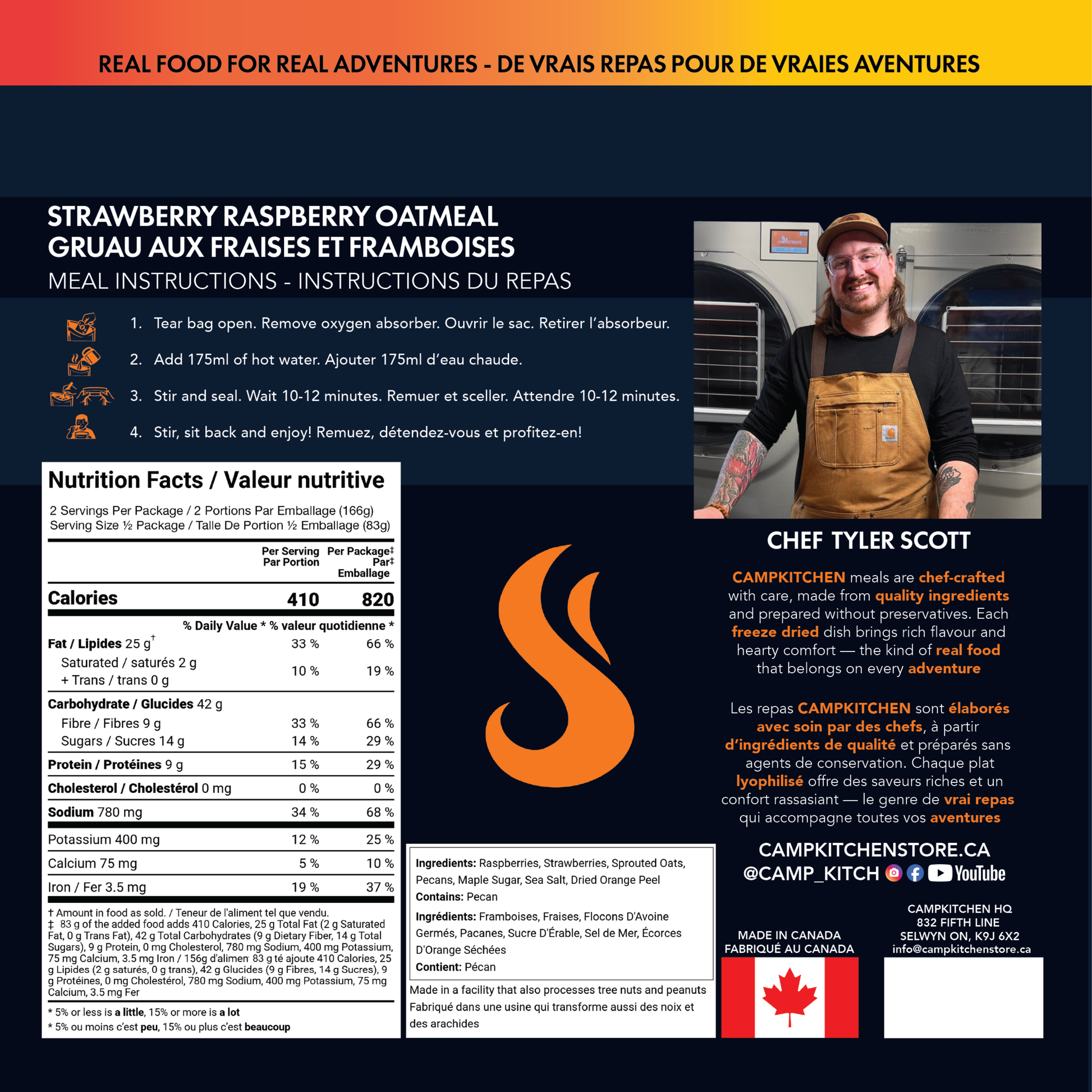This is oatmeal done right. CAMPKITCHEN Strawberry Raspberry Oatmeal delivers a bright, fruit-forward breakfast that feels full, balanced, and genuinely satisfying—far beyond what you’d expect from instant oatmeal.