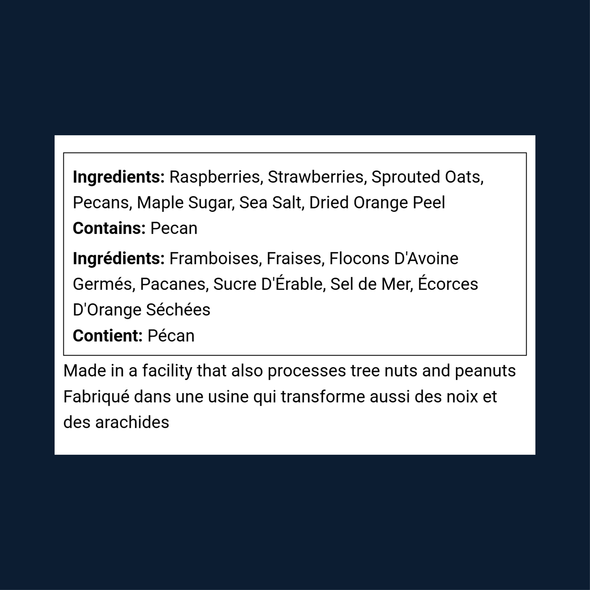 Certified Gluten Free sprouted oats form a creamy, hearty base, layered with the natural sweetness of strawberries and raspberries. Crunchy pecans add richness and texture, while maple sugar, sea salt, and a hint of dried orange peel bring warmth and subtle citrus lift that ties everything together. The result is a vibrant, comforting bowl that eats like a real meal, not a quick fix.